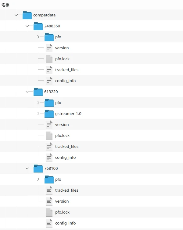 下圖是Proton Prefix的結構,每個資料夾的數字對應一個Steam遊戲ID,每個資料夾下面都有自己的C槽和設定檔。