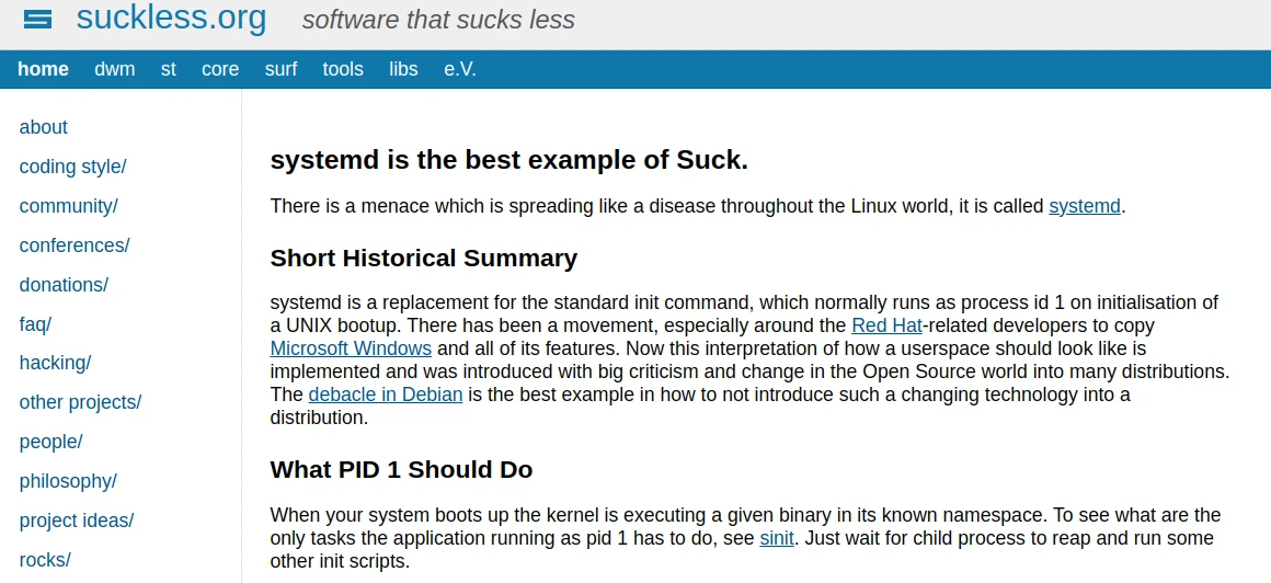 感覺suckless.org的理念跟1980年代的FSF、UNIX駭客社群有所重合呢。然而事與願違,軟體產業才不可能搞這一套呢,搞Web開發的更不可能。再繼續讀下去,他們的官網還洋洋灑灑的寫出了哪些軟體超酷,哪些軟體超爛,例如Linux社群萬年的吵架話題"systemd":