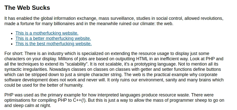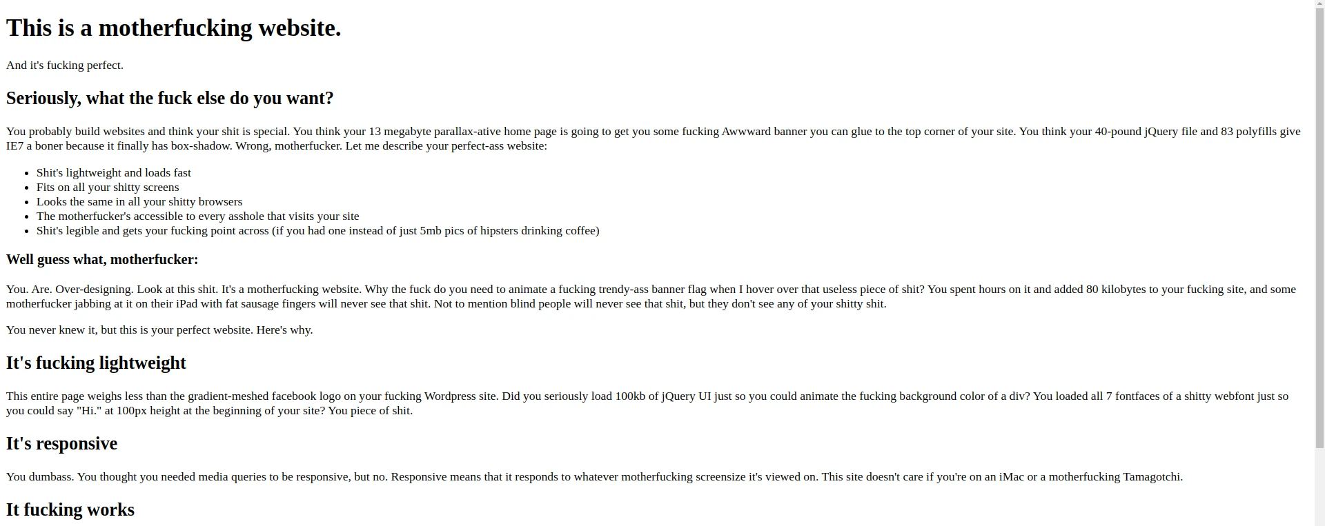 網頁上還舉了三個例子說明什麼才是好網頁:This is a motherfucking website