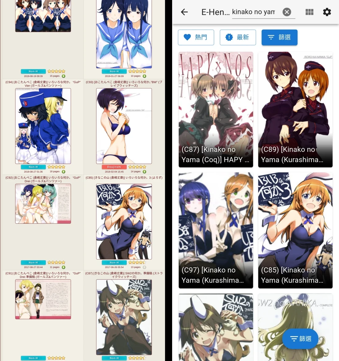 E-hentai手機網頁與Suwayomi E-Hentai頁面比較: