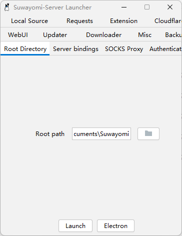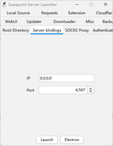 Suwayomi Launcher的選單設定Server bindings為0.0.0.0,這樣同一Wifi下的裝置就能連線到Suwayomi伺服器。