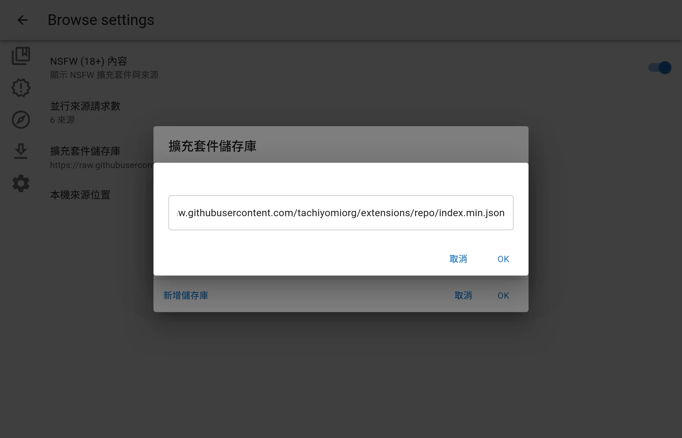 點選左邊設定 → 瀏覽 → 擴充套件儲存庫,填入儲存庫的網址