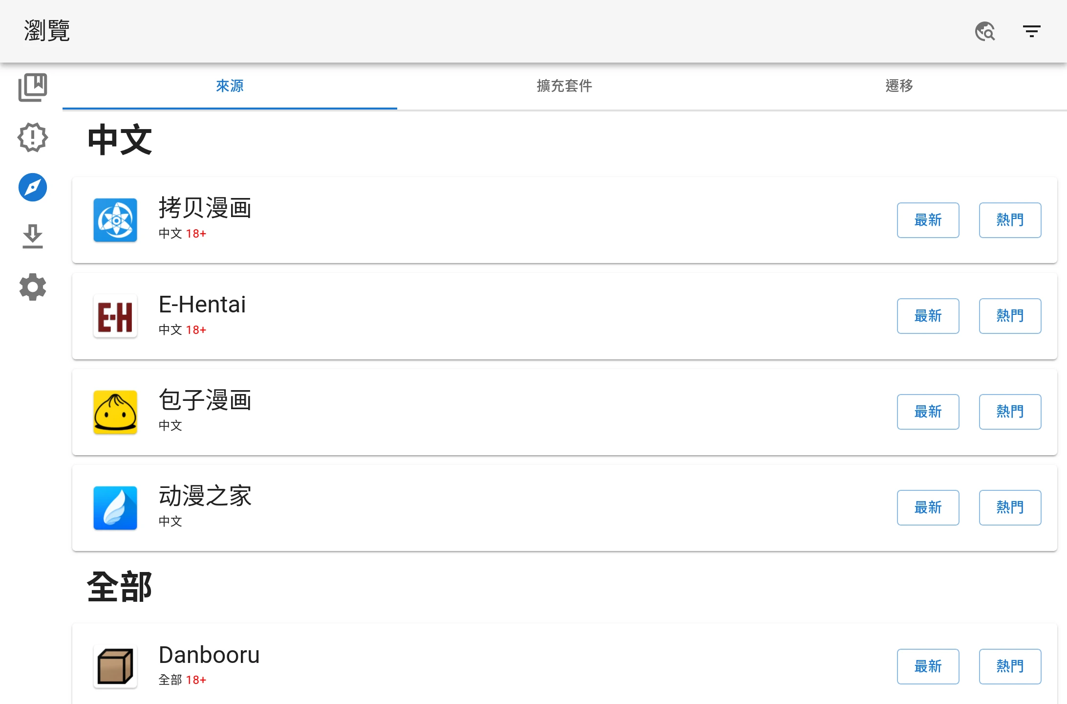 到「來源」頁面,同樣點選右上角啟用中文來源,才會顯示線上來源的漫畫。
