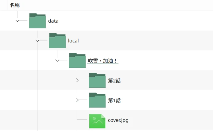 Suwayomi要求一個系列的漫畫一個資料夾,每個章節一個資料夾,所以我會這樣放置檔案: