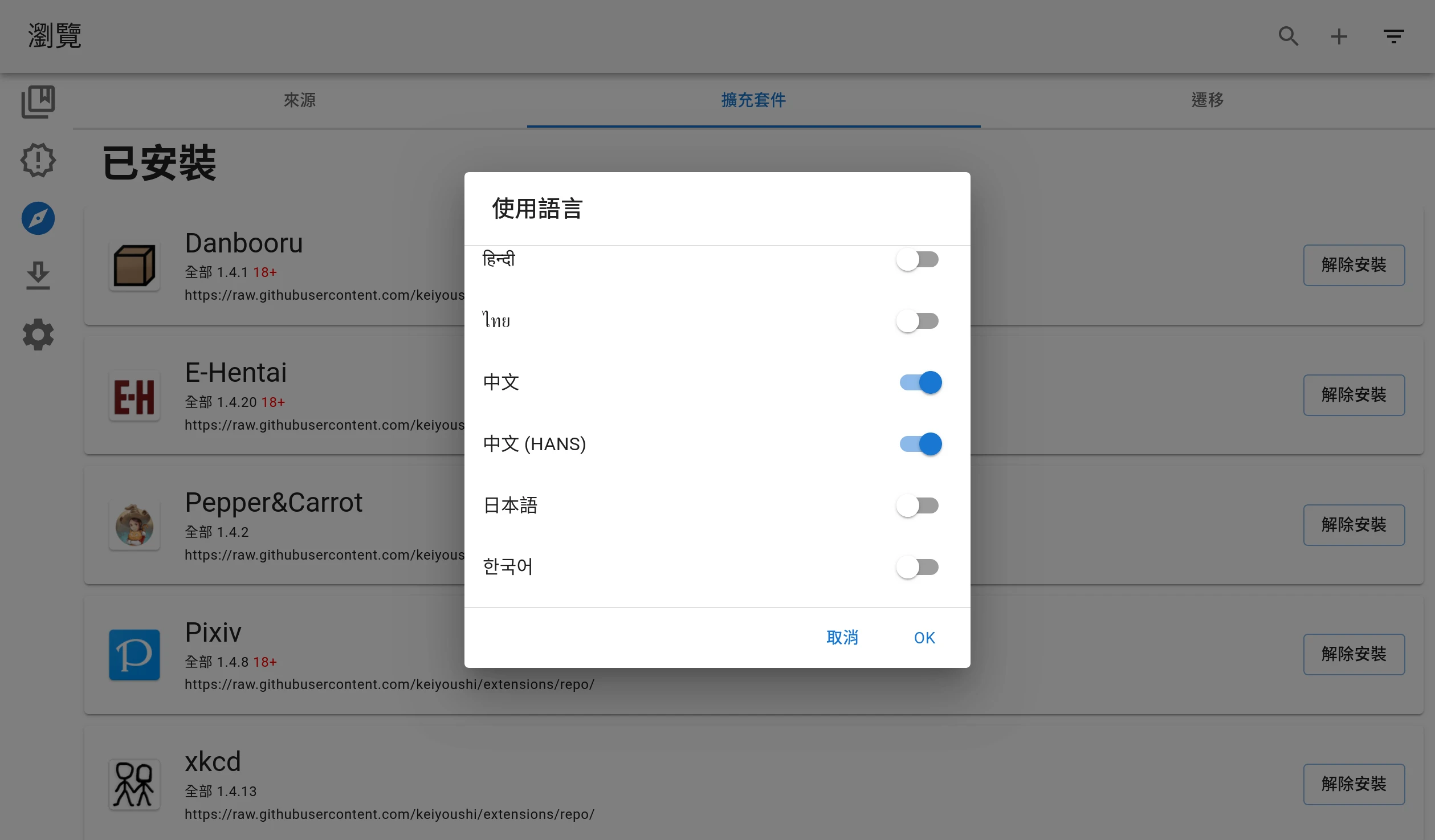 我用的是keiyoushi的儲存庫,裡面各大語言的來源都有了:https://raw.githubusercontent.com/keiyoushi/extensions/repo/index.min.json
