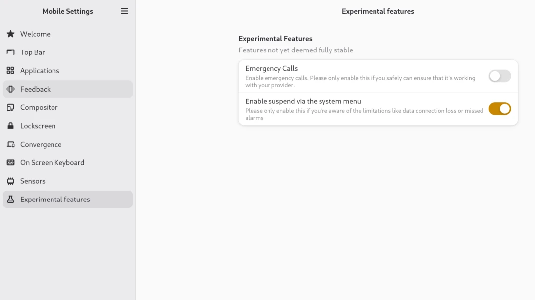 開啟Phosh Mobile Settings,允許從Phosh的狀態欄選單讓Linux進入睡眠模式(suspend)。另外這裡也可以開啟在狀態欄顯示Caffeine按鈕,可以讓Linux不會自動進入睡眠(Waydroid的螢幕開關無效)