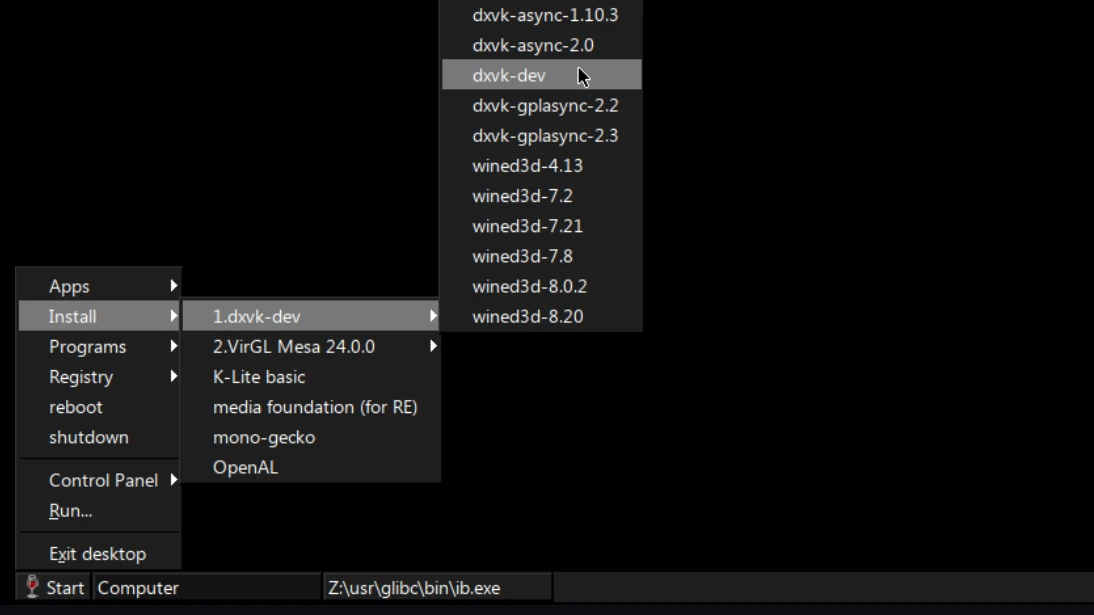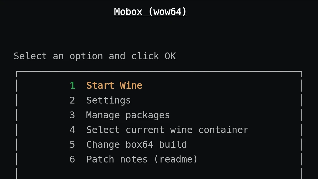 mobox指令啟動環境。使用畫面上的上下左右鍵,移動到Start Wine,按下Enter