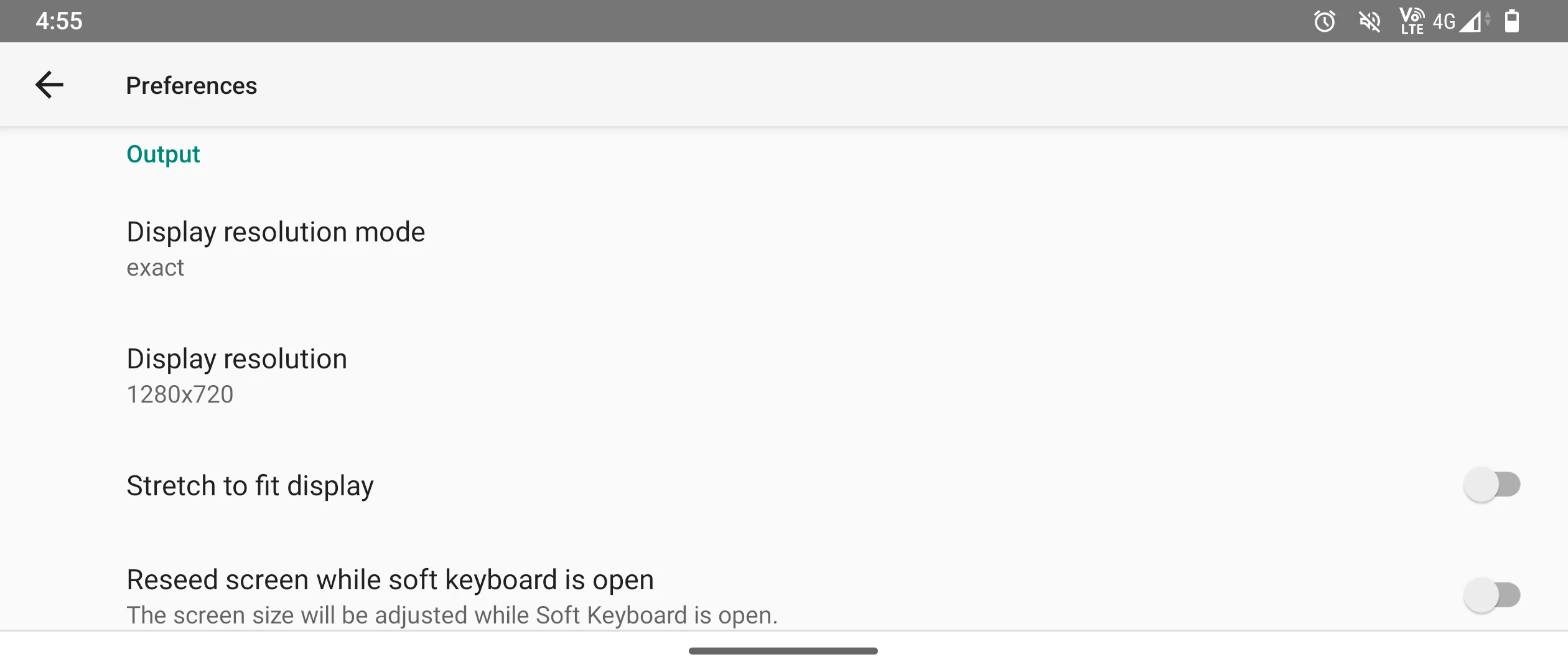 Preferences設定,把Display Mode設定為exact,Display Resolution設定為1280x720(你可以視手機性能設定更高解析度)。再將Reseed screen while software keyboard is open的選項取消勾選。並勾選Force Landscape Orientation。