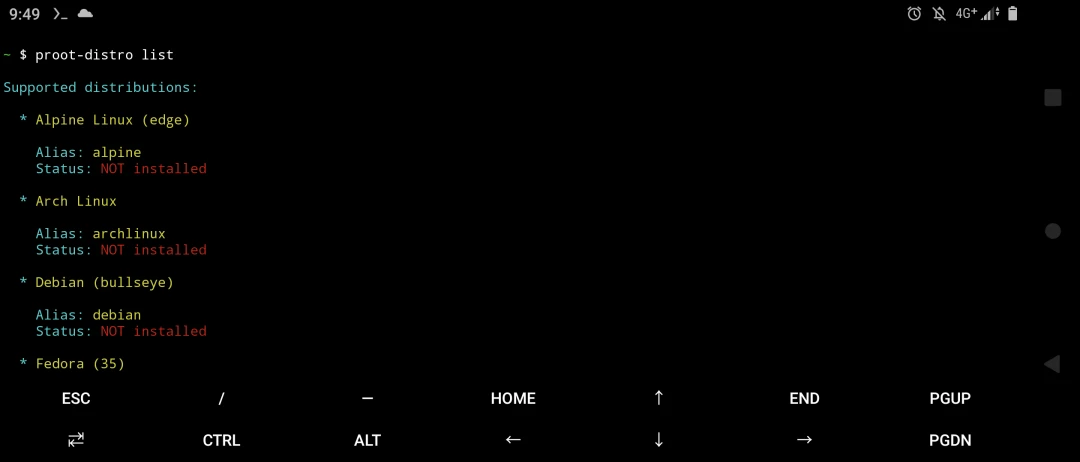 由於proot需要自行準備Linux系統的rootfs,指令又複雜,所以Termux提供了叫做proot-distro的工具(wrapper script),能自動安裝Termux官方維護的Linux發行版rootfs,並處理proot相關環境問題,這樣用起來就輕鬆多了。