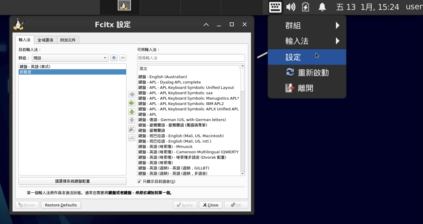 有外接鍵盤情況下,點選系統右上角的Fcitx5圖示,右鍵按下設定加入新酷音輸入法。並按CTRL+空白鍵切換注音輸入。