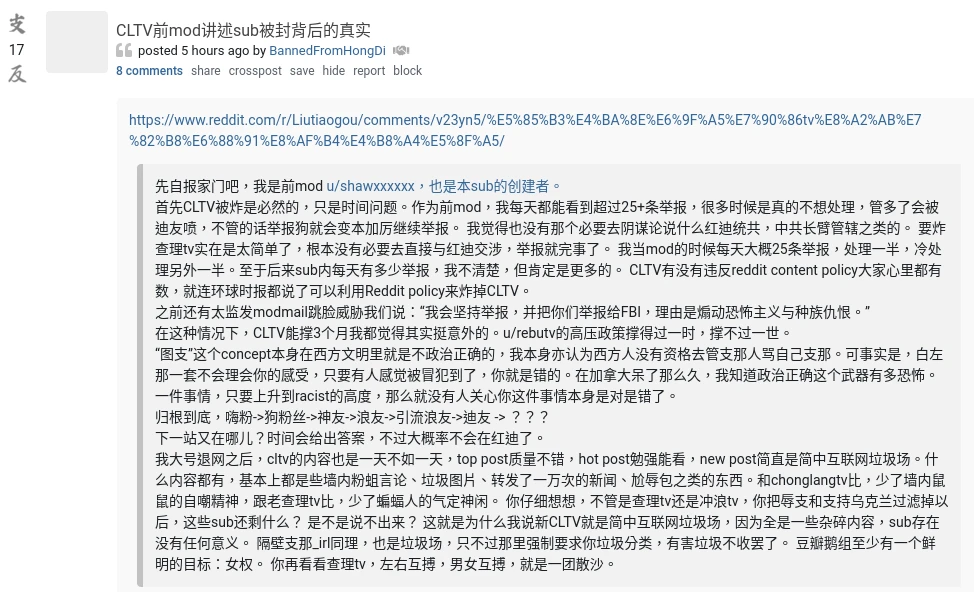 初稿發表於2022年6月1日,r/CTLV被封當天。2023年10月4日修訂