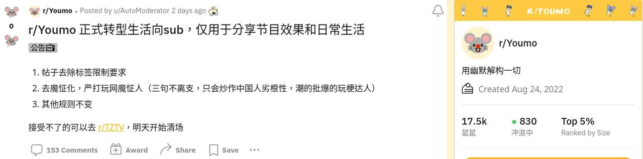 r/Youmo的前生r/YoumoTV也是被爆破,或許導致Mod想跟神友明確切割關係,板規寫明「禁止賽博屠支」,簡單來說鍵政的內容必須大幅減少。