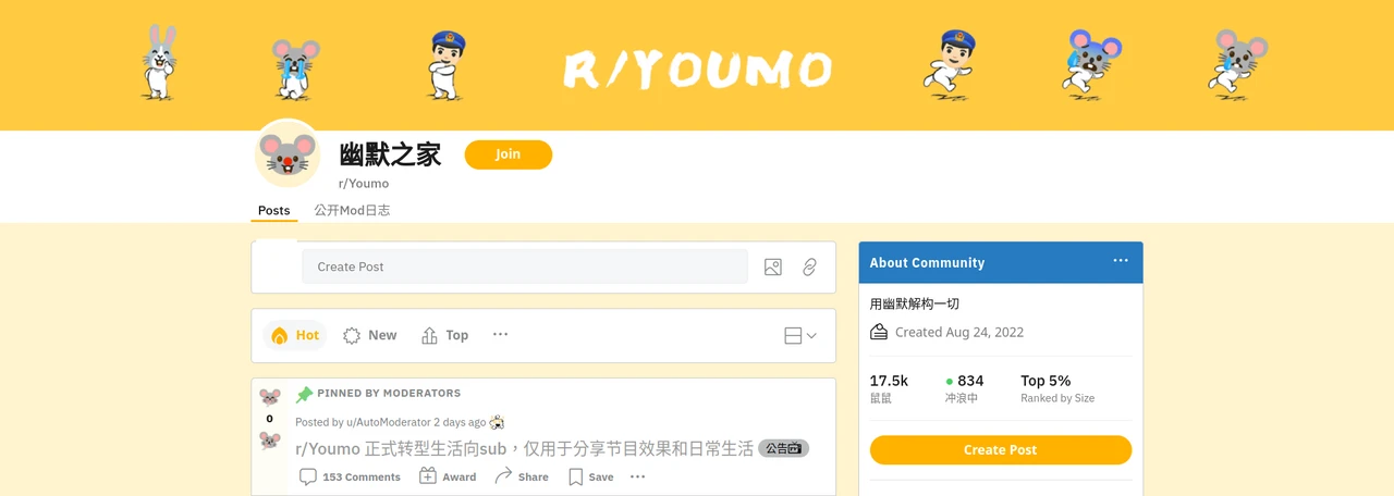 幽默之家r/Youmo是以鼠人為主題的Reddit sub,用戶自稱默友,繼承部份r/chonglangtv的精神。