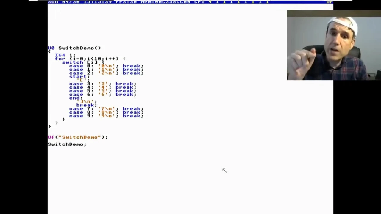 一般來說,如果要實現在數字3到6的區間前後加上括號[和]的功能,大多數程式設計師會寫一堆if (i==3) print("[")或者把迴圈拆開。但Terry Davis認為這破壞了switch語句的對稱性和簡潔性。