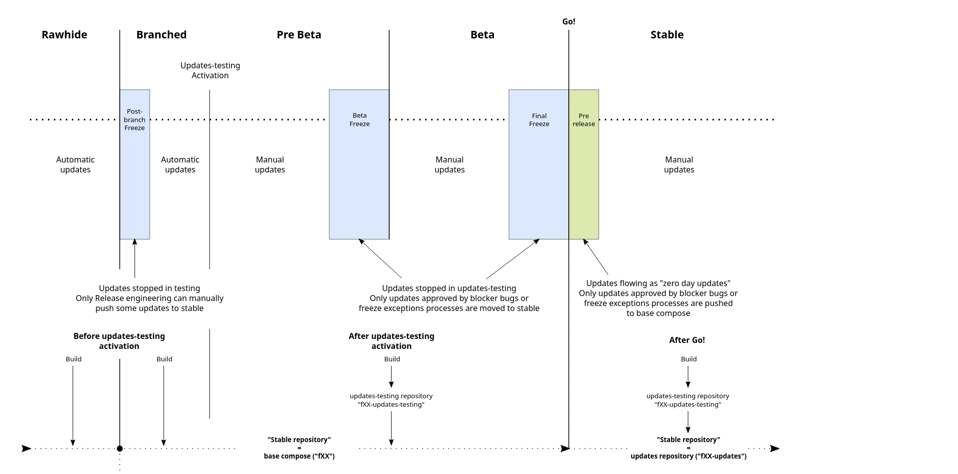 參考Fedora Updates policy,Fedora的上游有一個Rawhide的分支,套件經過開發者測試,投票,符合標準,認為穩定之後就會放到Beta,再放到Stable。