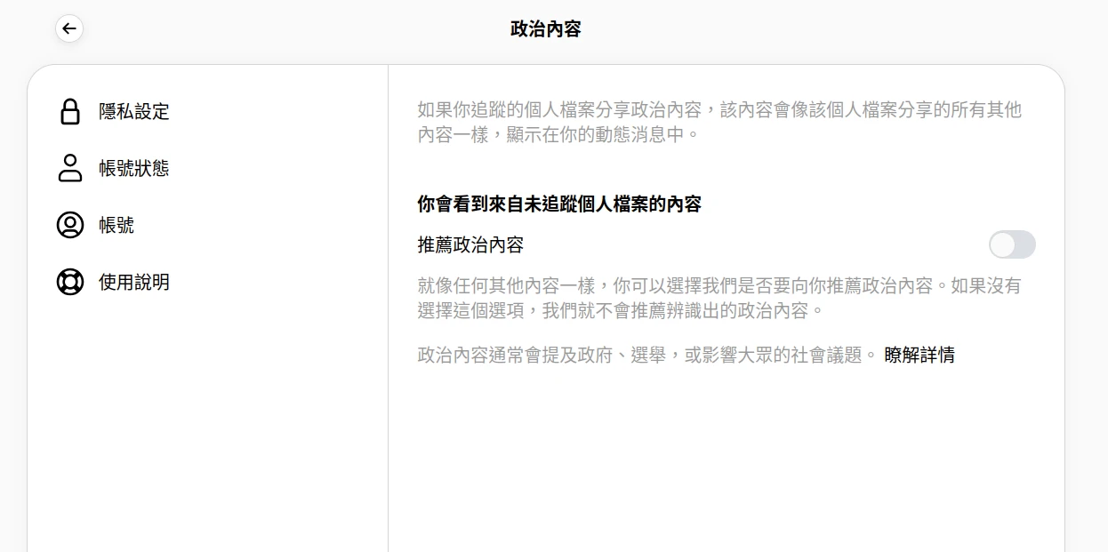 最好把帳號 → 推送政治內容也關閉。至於推送敏感內容可以測試不要關看看,因為其中可能會有好康的(?)
