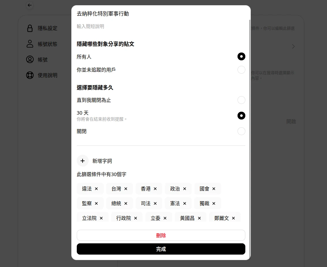 具體來說,點選Threads左下角的設定,在隱私設定,找到隱藏字詞。使用隱藏字詞功能,我必須將同立場的與反立場的政治相關名詞都封鎖,動態牆才會和諧一點。考慮到我要封鎖的是台灣繁體中文內容的佔大多數,參考報紙上常見的人物下去打擊就行。這裡要平等的封鎖才可以,不論是我支持的民眾「黨」或「政治人物」名字,還是反對派的民進黨政治人物都加進清單內。