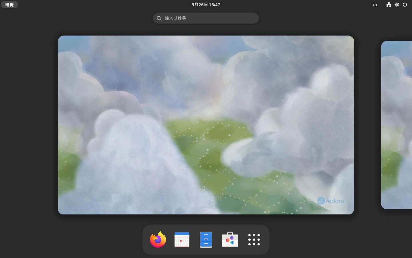 Fedora對套件修改不大,因此在這裡您可以享受到最純粹的GNOME桌面:以一工作區一視窗、手勢為主的工作體驗。