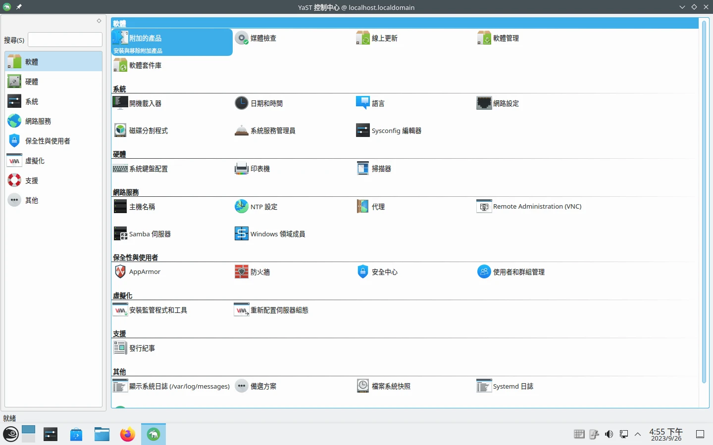 內建YaST管理工具,跟伺服器版本一樣強大,可以用圖形化界面管理系統升級、GRUB參數、防火牆設定、備份快照。