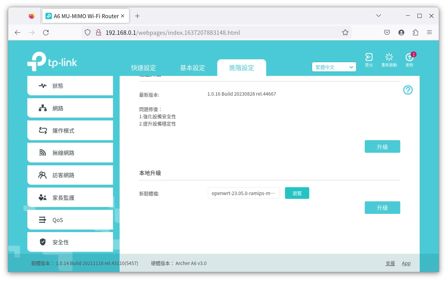 http://192.168.0.1或http://192.168.1.1,登入TP-Link後台界面。進入進階設定,點選升級韌體,上傳*.bin檔案。