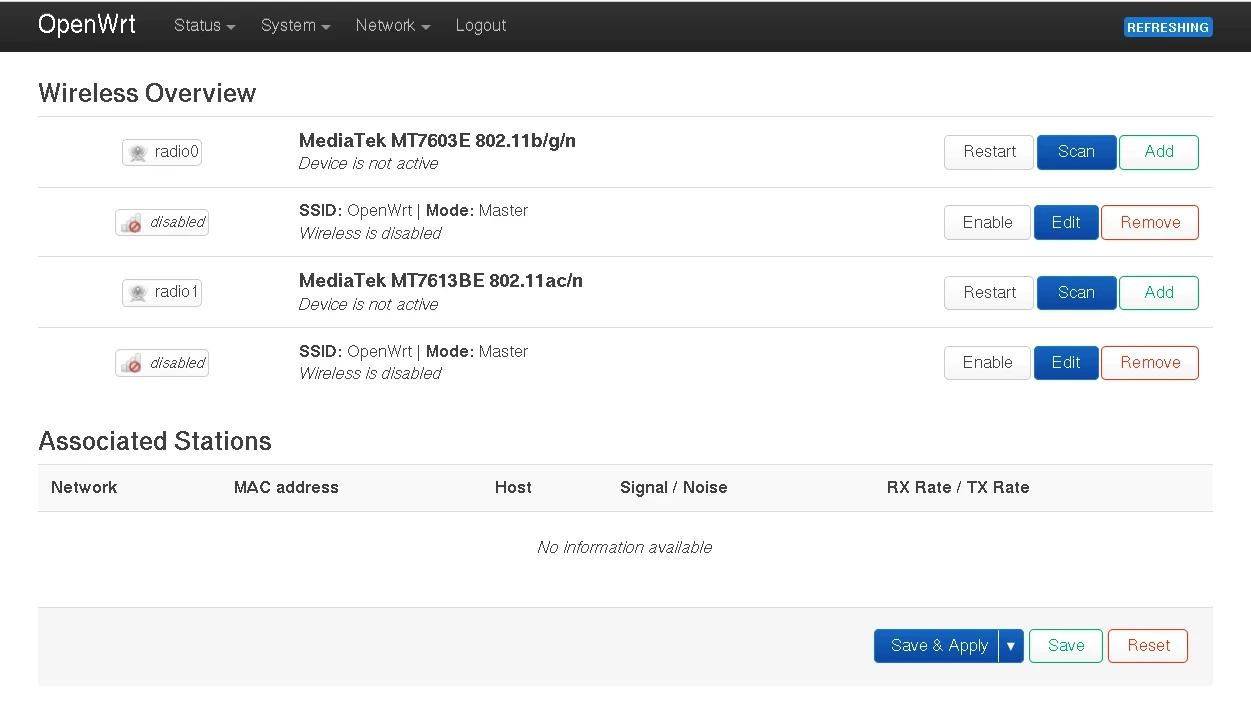我等會會將路由器直接用WAN連接到數據機(Modem),OpenWrt應該會自動偵測網路連線,到Network → Wireless,將Wifi啟用