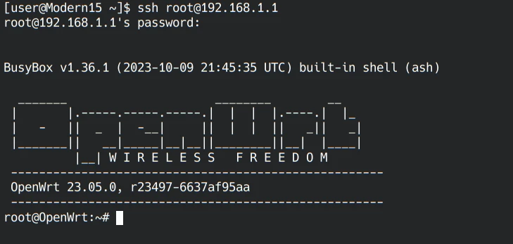 將路由器接上數據機。確認Wifi能運作的情況下,執行指令:ssh root@192.168.1.1