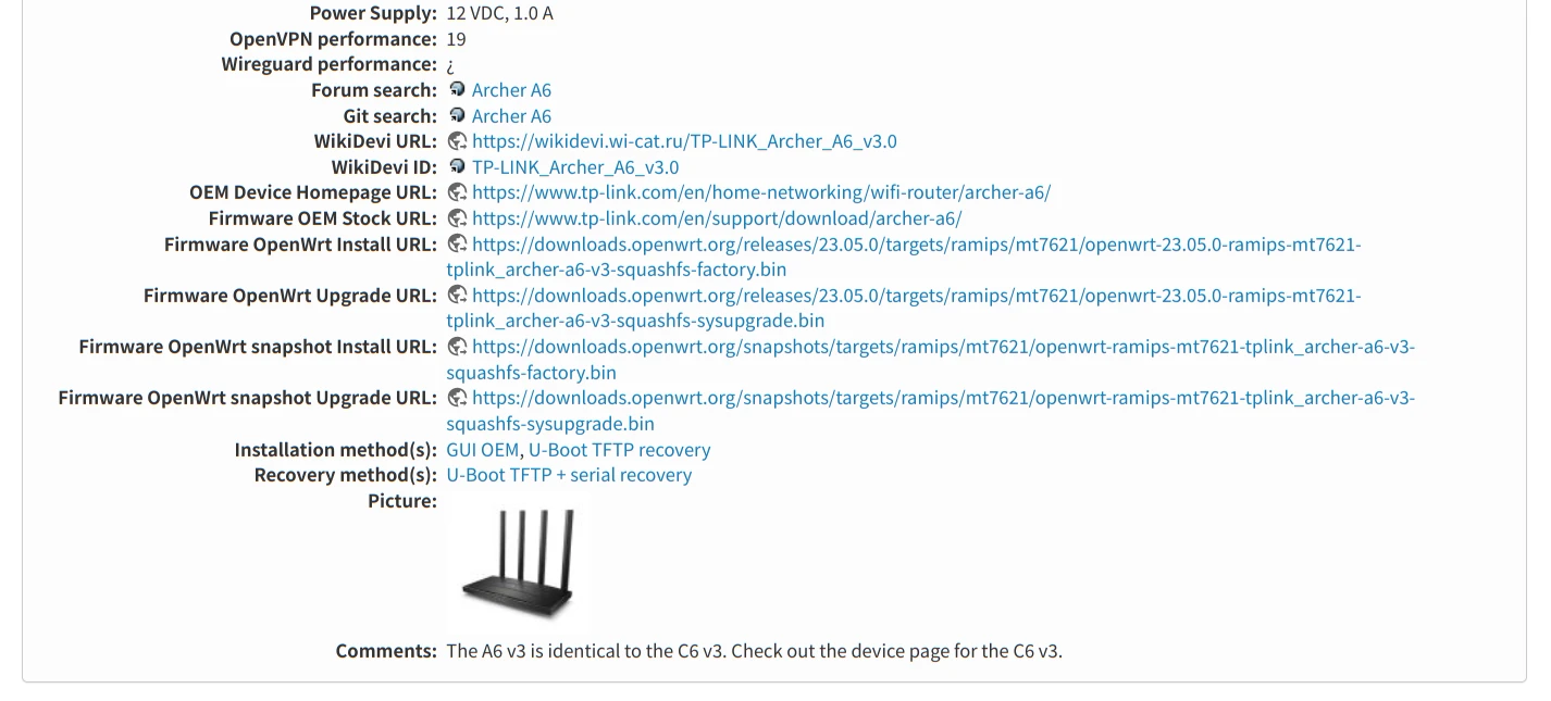 到OpenWrt官網查詢路由器支援程度,版本需精確,路由器只要一改版晶片可能就不一樣了。TP-Link Archer A6 v3使用的是MediaTek MT7621DAT處理器,mipsel架構。該路由器的頁面有23.05.0韌體可以下載