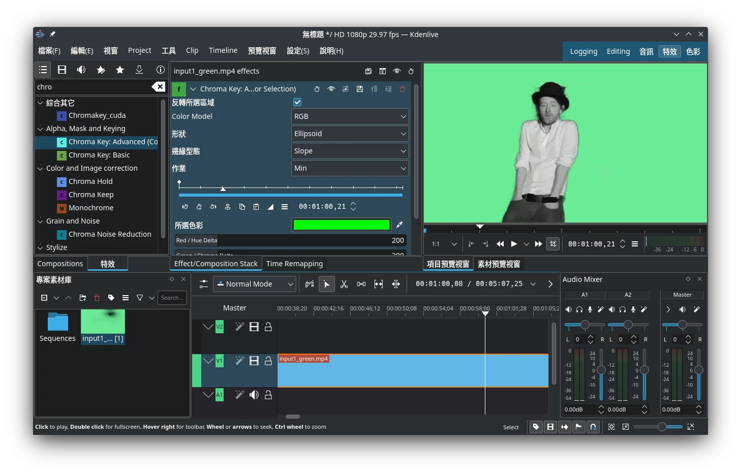 Transparent Background不只可以去背,也能生成綠幕,之後就可以放到Kdenlive等剪輯軟體,做進一步加工。如圖,Kdenlive的Chroma Color Selection特效能夠一鍵去綠幕。