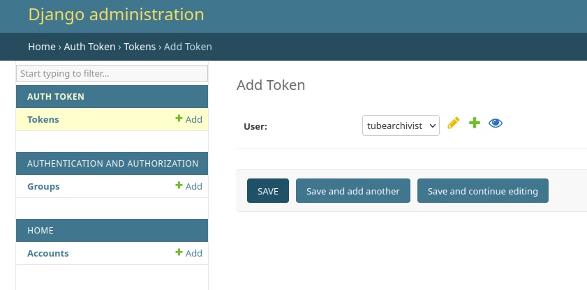 點選Tube Archivist右上角設定 → User → User Management → Admin Interface → Auth Token,按Add,新增API金鑰