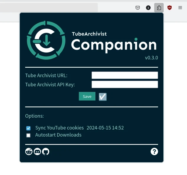 開啟擴充功能,填入Tube Archivist的網址和API金鑰。勾選Sync Youtube cookies可以方便你下載會員限定影片。