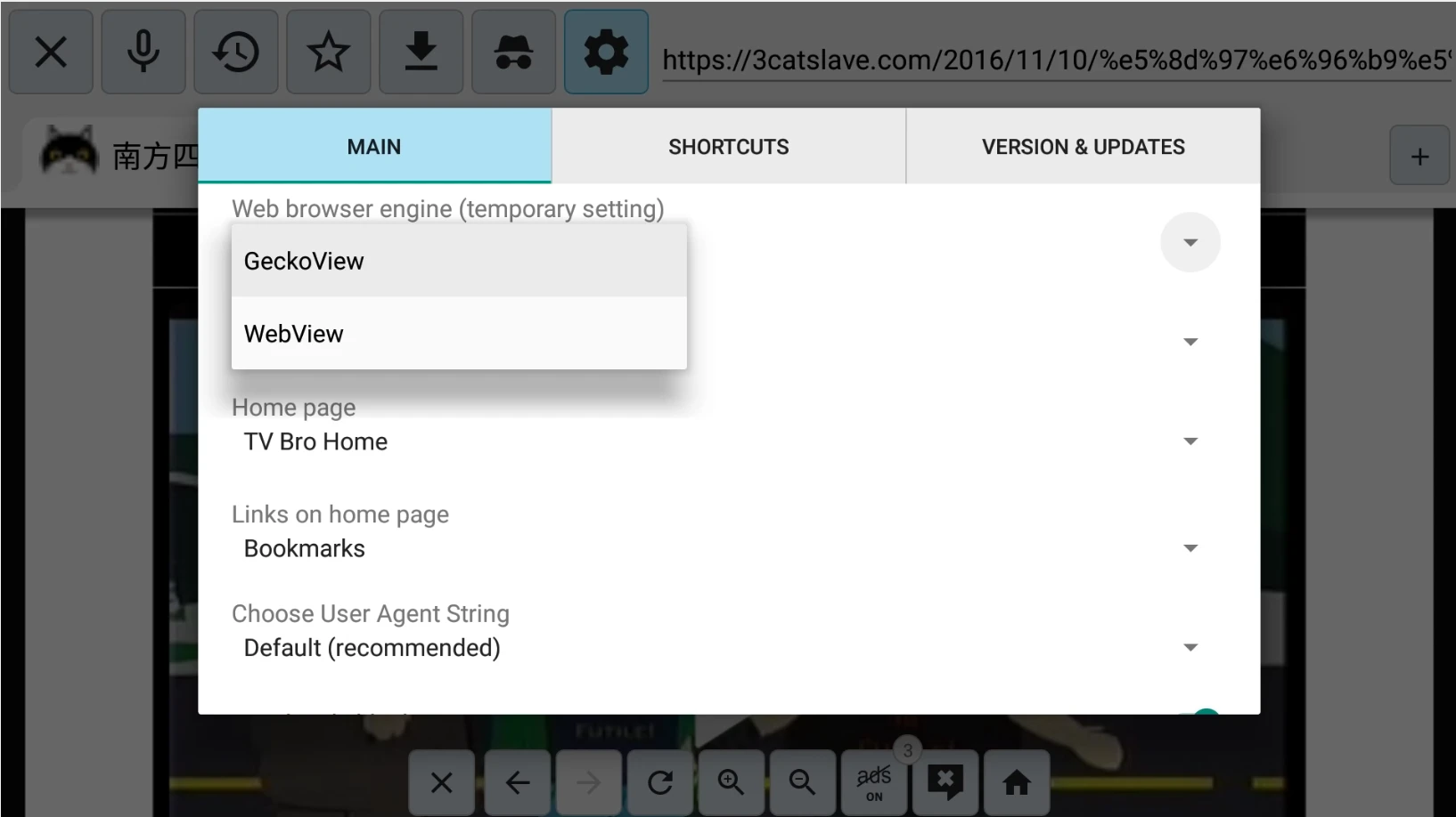 TV Bro預設的瀏覽器引擎是GeckoView (Firefox的引擎),如果有需要可在設定變更為Webview (Chrome的引擎)。