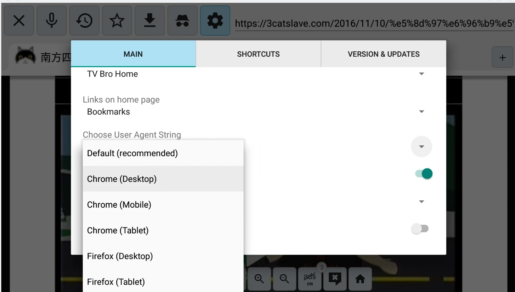另外,TV Bro預設的UserAgent是Android手機,某些網站的手機版網頁在電視上可能顯得過於巨大。