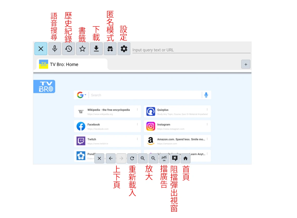 TV Bro功能如下圖所示,我在圖上標注出來了。您可以開啟擋廣告和阻擋彈出視窗的功能,你知道的…有些迷版網站廣告多的嚇死人