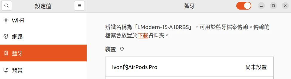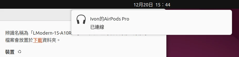 將AirPods Pro盒子開啟,長按背後按鈕亮白光,Ubuntu應該會看到AirPods Pro耳機,點選配對。