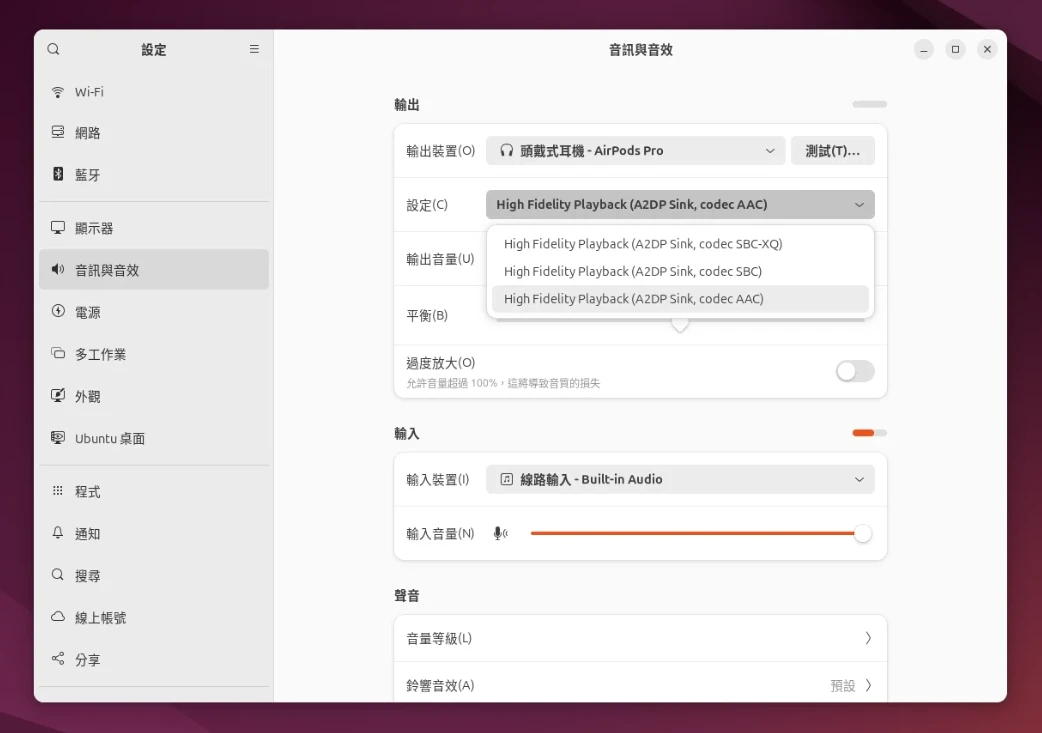 因此,GNOME系統設定 → 音訊面板只會顯示「SBC」和「SBC-XQ」。AAC的音質比SBC高一點點,但SBC-XQ的音質又比AAC高了,我個人認為沒有安裝AAC解碼器之必要。