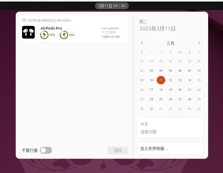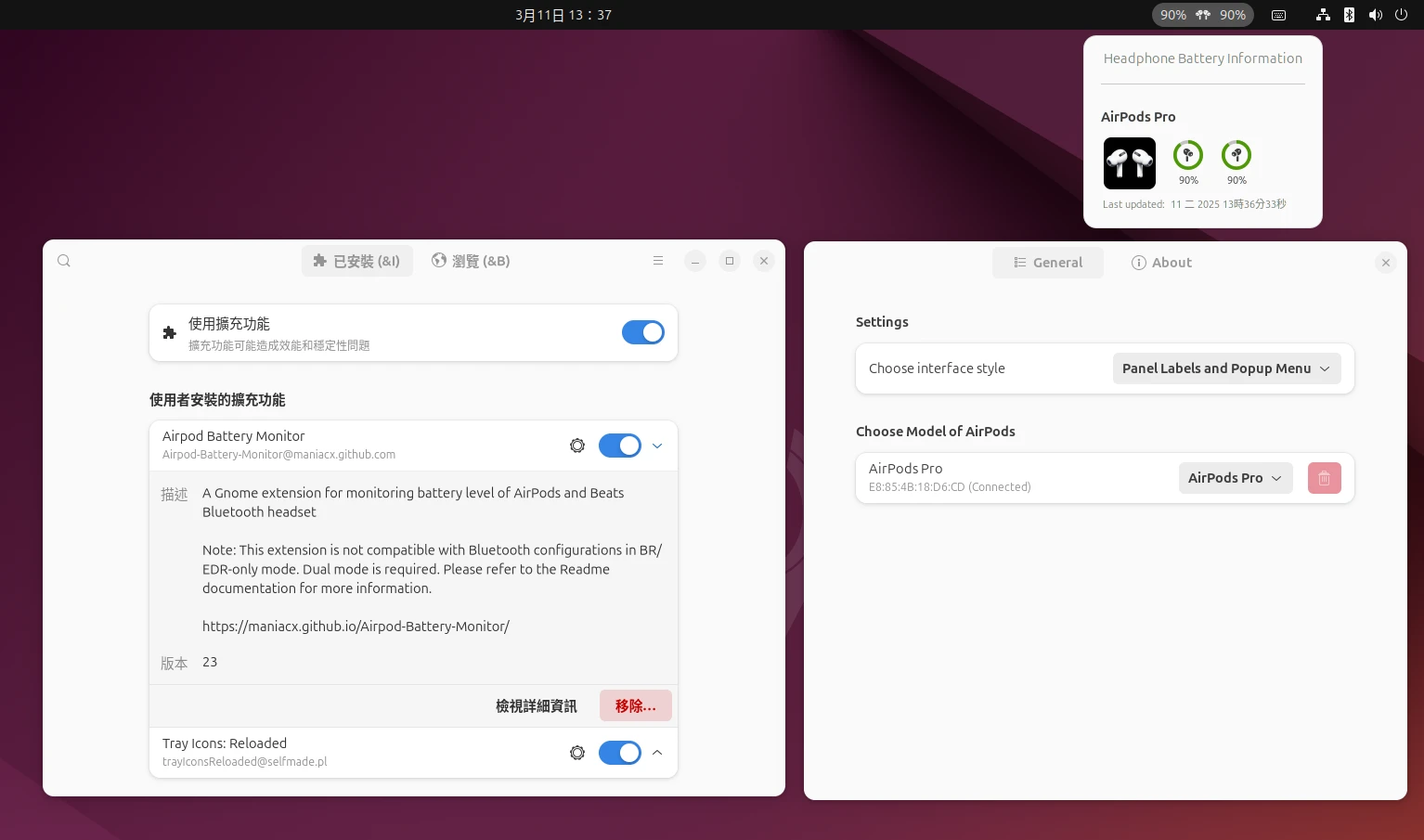 Ubuntu使用GNOME桌面,透過Extension Manager安裝Bluetooth Battery Meter或者Airpods Battery Monitor。