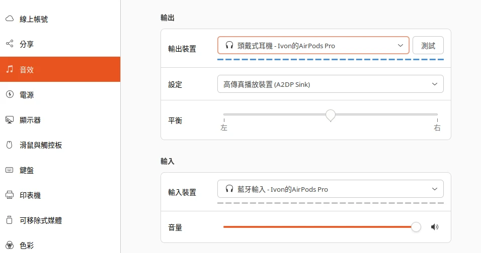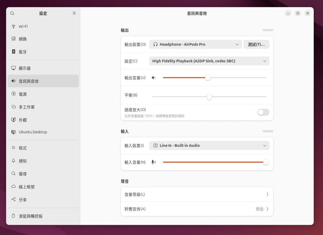 要使用AirPods麥克風,請在Ubuntu系統設定 → 音訊,將輸入裝置切換到「Handsfree (HSP/HFP)」模式。