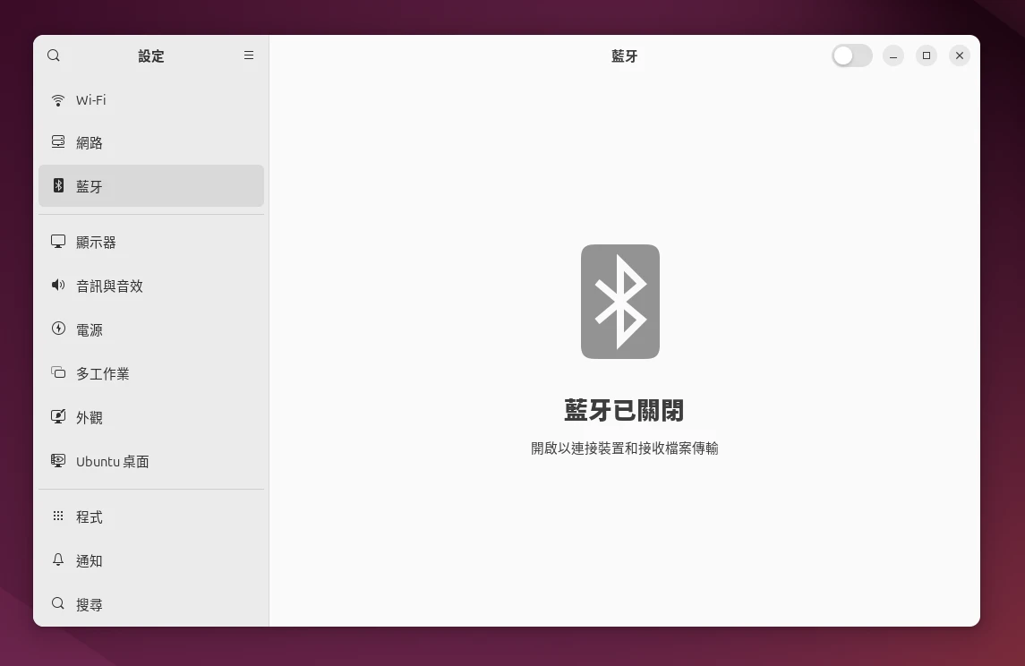 務必確保電腦的藍牙正常運作。請先嘗試開啟Ubuntu系統設定 → 藍牙,看是否能開啟藍牙。