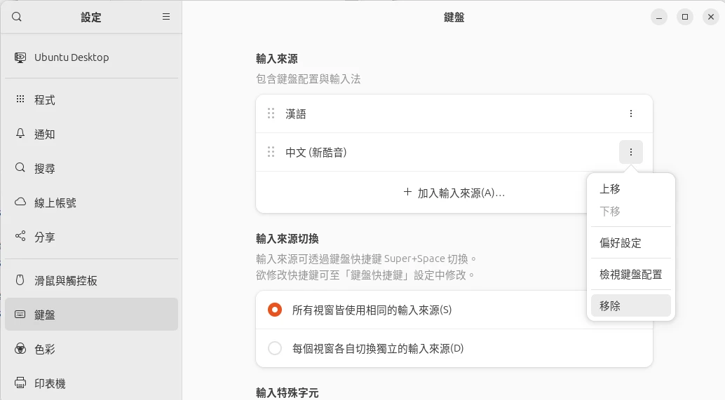 開啟Ubuntu系統設定 → 鍵盤 → 輸入來源,點三點,移除中文(新酷音)輸入法。