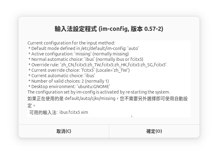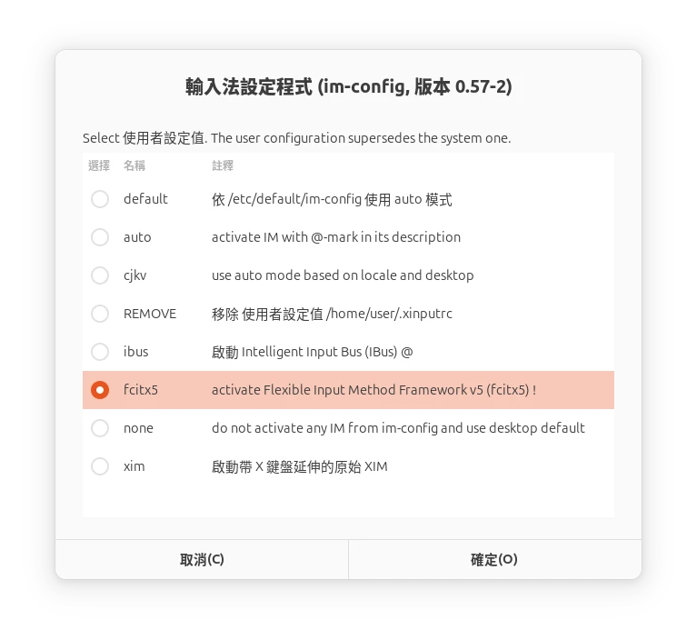im-config指令,點選確定。這個程式會自動編輯~/.xinputrc檔案的內容。