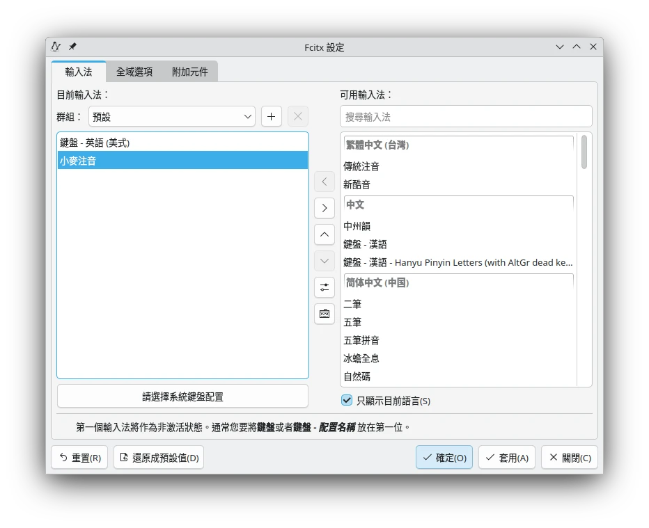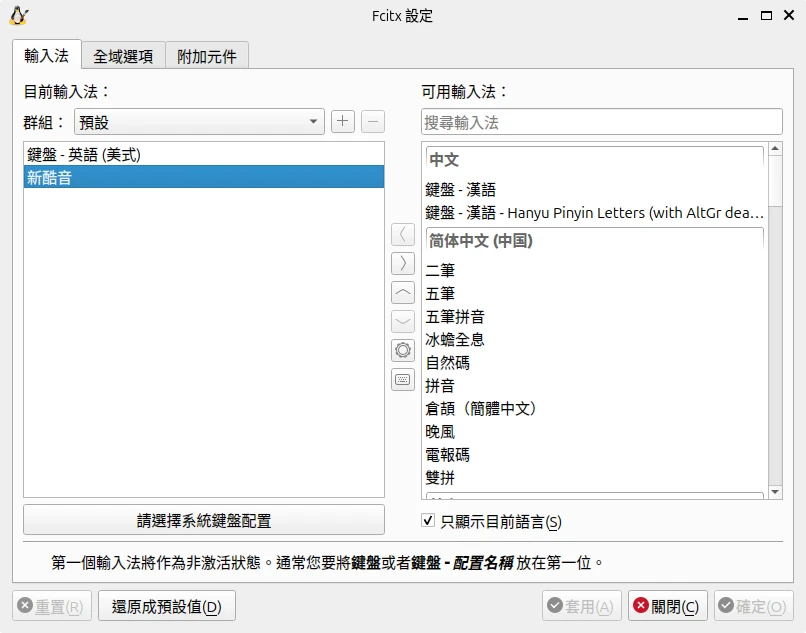 開啟Fcitx5設定面板,新酷音注音輸入法應該已經啟用。若無則從右邊面板,取消勾選「只顯示目前語言」,找到「新酷音」,將其加入到左邊的面板。