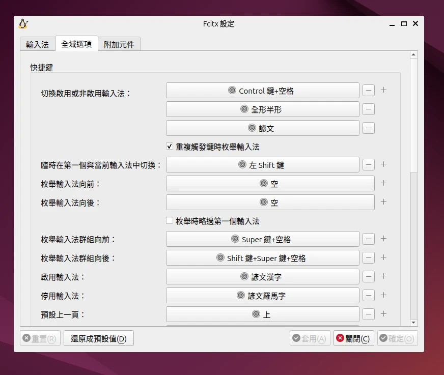 | CTRL + SHIFT + F | 切換Fcitx5簡繁輸入。 |