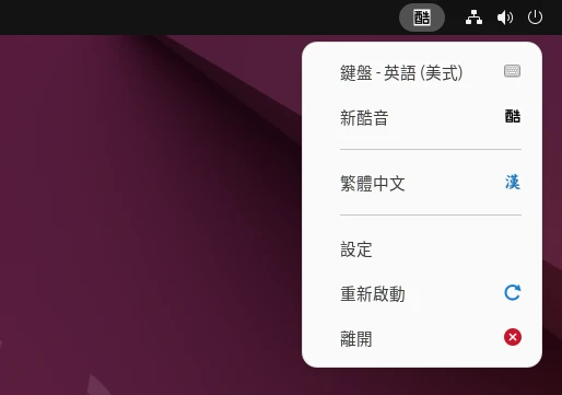 設定好Fcitx5後,GNOME桌面右上角會顯示目前的新酷音輸入法,還有切換簡繁輸入的按鈕。如果你看不到此面板,請安裝Input Method Panel擴充套件