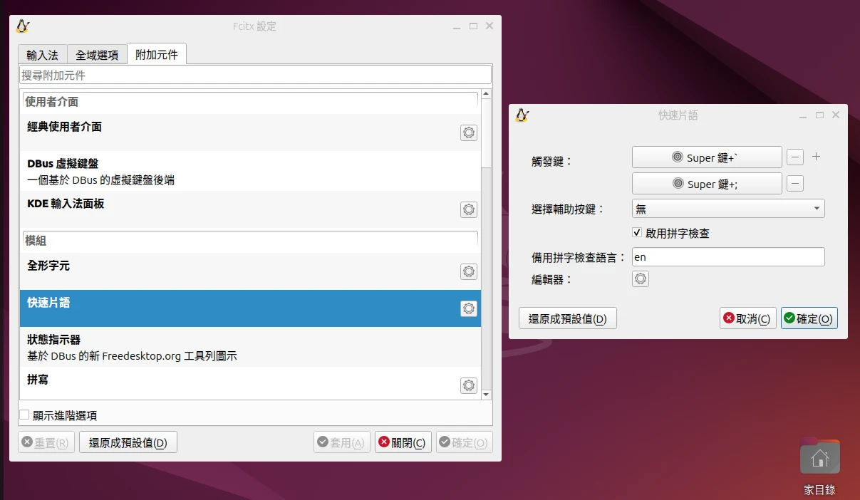 Fcitx5的全域設定可以設定常用片語,這樣按Windows鍵+「`」便能快速輸入常用字彙。