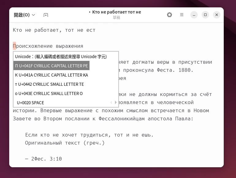在文字編輯器選取字元,再按CTRL + SHIFT + ALT + U可查看其Unicode編碼。在空白處按下前述的組合鍵則能用Unicode編碼打字。