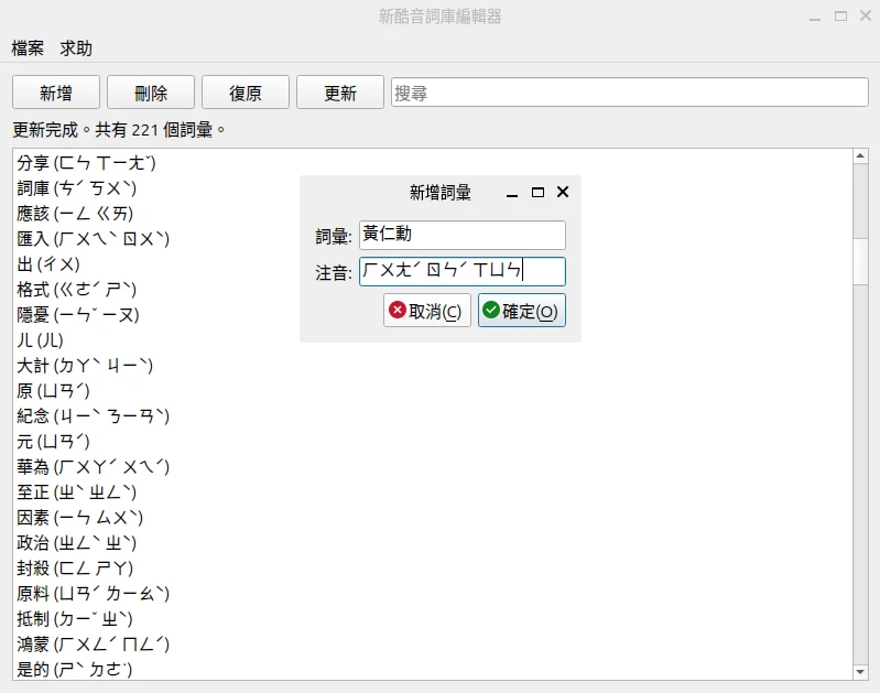 開啟後即可編輯新酷音的詞庫,只要新增詞彙和注音(中間要有空格),就能讓新酷音記住這個新詞。下次打字應該就會一次選對了。