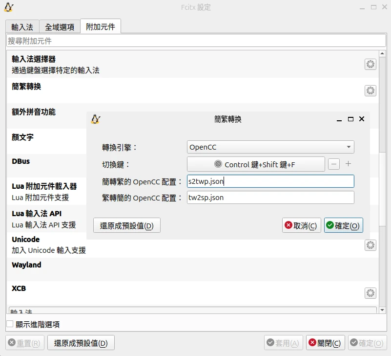 按下CTRL + SHIFT + F切換繁簡輸入,Fcitx5預設只會把繁體字轉簡體字。
