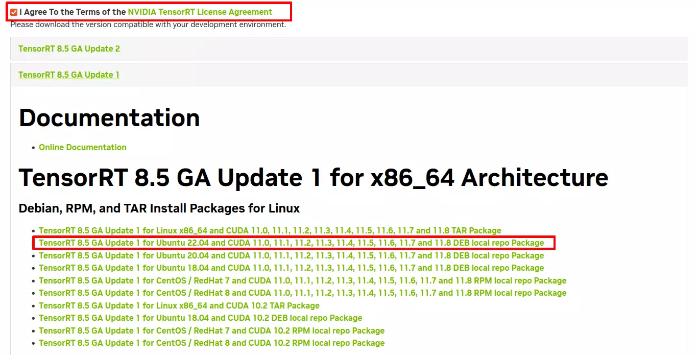 TensorRT目前還沒有PPA可以用,很多套件都找不到,必須註冊Nvidia帳號下載匯入。至Nvidia官網註冊帳號,登入,勾選同意授權條款,點選TensortRT 10,選Ubuntu 22.04的deb檔下載