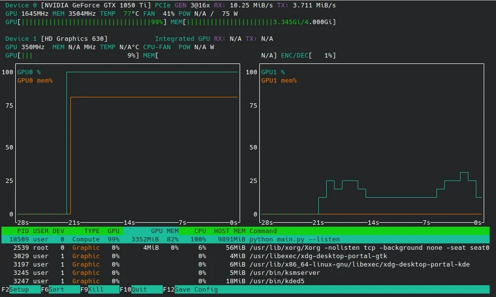 不過nvidia-smi的資料太簡陋,建議透過nvtop工具查看,它能夠詳細顯示3D渲染與影片編解碼的使用率,並且支援Intel與AMD的GPU。