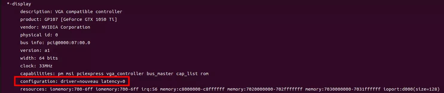 sudo lshw -C display確認,driver區段會顯示"nouveau"